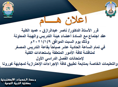 يعقد الأستاذ الدكتور ناصر عبدالرازق – عميد الكلية – اجتماعاً مع السادة أعضاء هيئة التدريس والهيئة المعاونة يوم السبت الموافق 2021/1/9 يقاعة التدريس المصغر في تمام الساعة العاشرة صباحاً