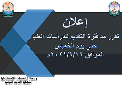 اعلان / اخبار / By editor / September 9, 2021 . تقرر مد فترة التقديم للدراسات العليا حتى يوم 2021/9/16م
