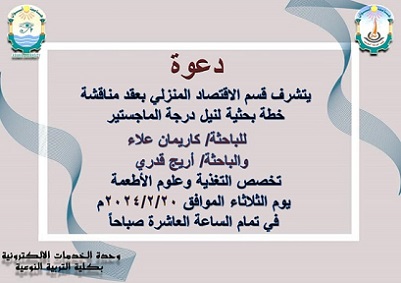 تقرر عقد سيمنار بقسم الاقتصاد المنزلي للباحثتين كريمان علاء وأريج قدري يوم الثلاثاء الموافق 20/2/2024 في تمام الساعة العاشرة صباحاً