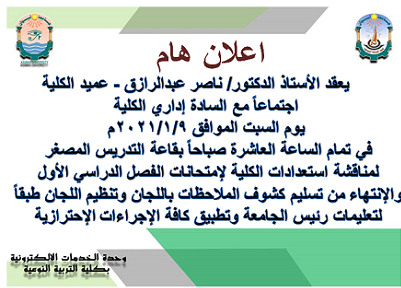 يعقد الأستاذ الدكتور ناصر عبدالرازق – عميد الكلية – اجتماعاً مع السادة اداري الكلية يوم السبت الموافق 2021/1/9 يقاعة التدريس المصغر في تمام الساعة العاشرة صباحاً