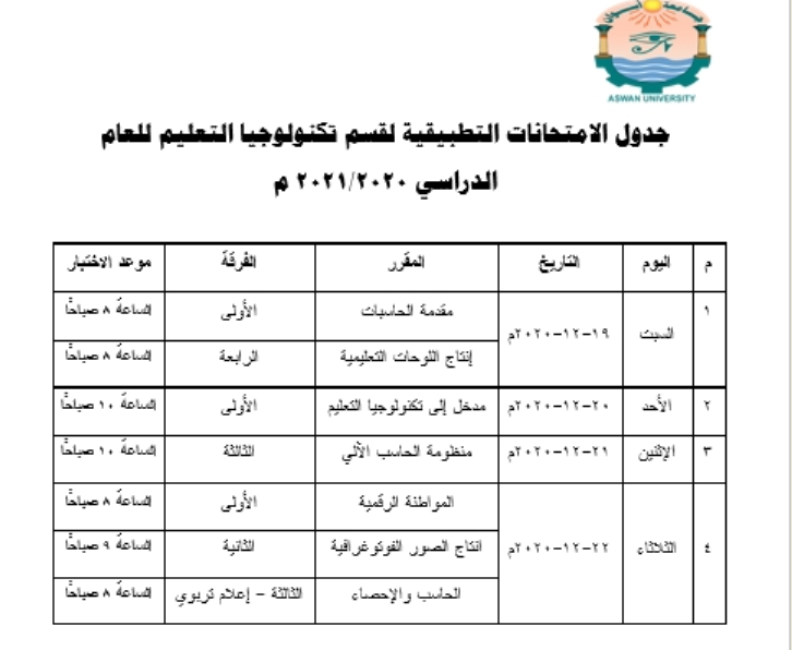 جدول امتحانات العملي لشعبة تكنولوجيا التعليم
