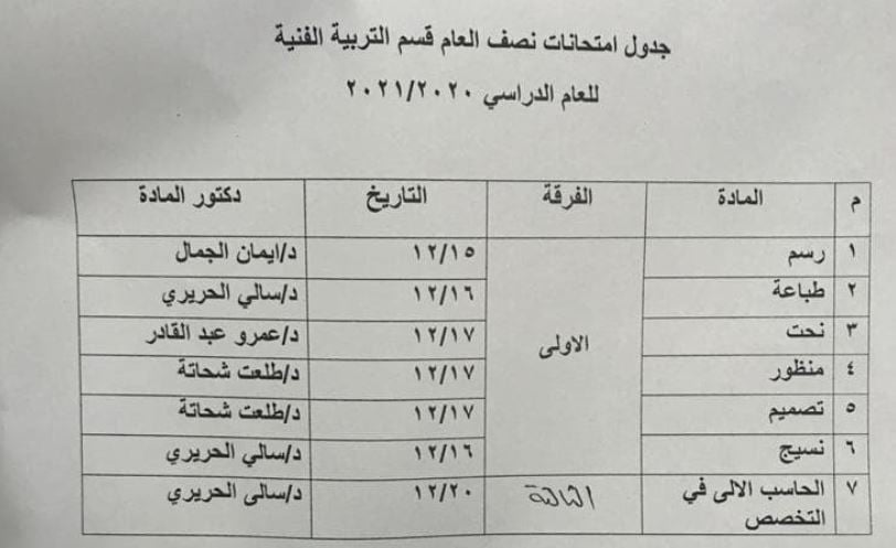 جدول امتحانات العملي لشعبة التربية الفنية / اخبار / By editor / December 13, 2020 . تم نشر جدول امتحانات العملي للفرقة الأولى والثالثة – شعبة التربية الفنية على الرابط التالي: جدول الإمتحانات