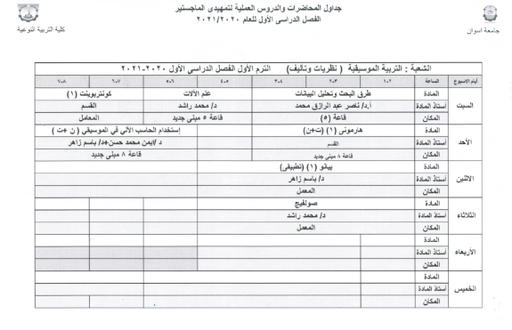جدول محاضرات تمهيدي ماجستير / اخبار / By editor / December 2, 2020 . تم نشر جدول المحاضرات والدروس العملية – تمهيدي ماجستير – المستوى الأول الفصل الدراسي الأول شعبة التربية الموسيقية تخصص ( نظريات وتأليف ) على الرابط التالي: http://spec.aswu.edu.eg/wp…/uploads/2020/12/120120.png