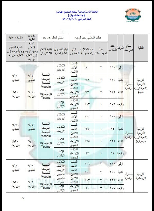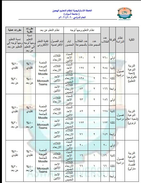 خطة الجامعة الإستراتيجية في التعليم الهجين / اخبار / By editor / October 13, 2020 . تعلن جامعة أسوان برئاسة الأستاذ الدكتور/ أحمد غلاب محمد – رئيس الجامعة عن جداول خطة الجامعة الإستراتيجية في التعليم الهجين للعام الدارسي 2021/2020 بكلية التربية النوعية – جامعة أسوان شعبة التربية الموسيقية والتربية الفنية شعبة الإقتصاد المنزلي والإعلام التربوي وتكنولوجيا التعليم