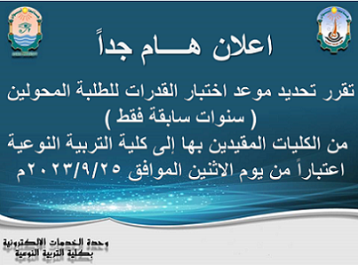 تم تحديد موعد اختبار القدرات للطلبة المحولين -سنوات سابقه – يوم الاثنين الموافق 25/9/2023 في تمام الساعه التاسعة صباحاً.