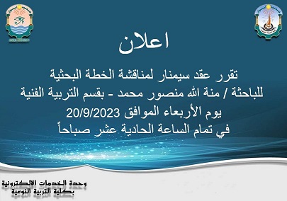 تقرر تحديد سيمنار الباحثة / منة الله منصور محمد – بقسم التربية الفنية يوم الأربعاء الموافق 20/9/2023.