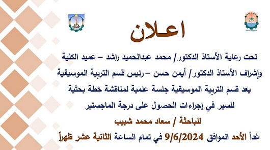 تقرر عقد سيمنار لقسم التربية الموسيقية للباحثة/ سعاد محمد شبيب – غداً الأحد الموافق 9/6/2024 في تمام الساعة الثانية عشر ظهراً.ِ