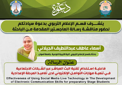 دعوة لحضور مناقشة رسالة الماجستير للباحثة / أسماء عاطف – بقسم الإعلام التربوي – يوم الخميس الموافق 4/7/2024 بقاعة الدكتور/ أحمد فوزي .. في تمام الساعة التاسعة صباحاً.