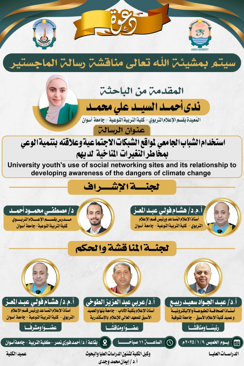 دعوة لحضور مناقشة رسالة الماجستير المقدمة من الباحثة/ ندى أحمد السيد – المعيدة بشعبة الإعلام التربوي – يوم الخميس الموافق 9/1/2025 في تمام الساعة الحادية عشر صباحاً بقاعة الدكتور / أحمد فوزي.