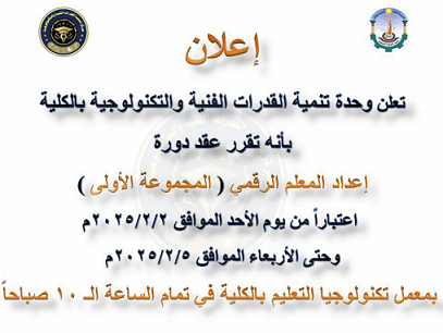 تقرر عقد دورة إعداد المعلم الرقمي ( المجموعة الأولى ) اعتباراً من يوم الأحد الموافق 2025/2/2م وحتى الأربعاء الموافق 2025/2/5م بمعمل تكنولوجيا التعليم بالكلية في تمام الساعة الـ 10 صباحاً.