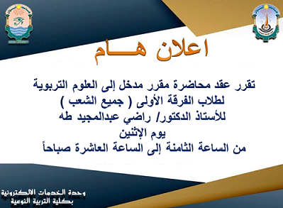 اعلان لطلاب الفرقة الأولى / اخبار / By editor / October 13, 2022 تحديد موعد محاضرة مدخل العلوم التربوية لطلاب الفرقة الأولى – جميع الشعب – يوم الإثنين في تمام الساعة الـ 10 صباحاً.