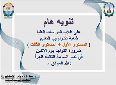 تنويه هام / اخبار / By editor / October 20, 2019 تنويه هام لطلاب الدراسات العليا شعبة تكنولوجيا التعليم – المستوى الأول + المستوى الثالث