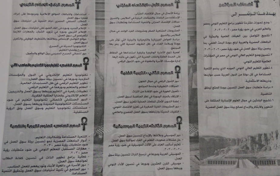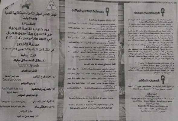 تعتزم كلية التربية النوعية بجامعة المنوفية بعقد المؤتمر العلمي الدولي الثامن في الفترة من 2021/11/21 حتى 2021/11/25 سبتمبر  وذلك تحت عنوان – دور كليات التربية النوعية في تحسين بيئة سوق العمل في ضوء رؤية مصر 2020-2030 –بمدينة الأقصر.