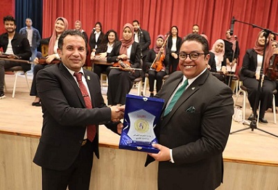 Prof. Karim Hassan Hammam – Director of the Institute for Leadership Development at Ministry of Higher Education – praised the distinguished participation of the Faculty choir led by Prof. Mohamed Abdel-Hamid Rashed – Faculty Dean – in the celebration that was held in the Field Marshal Tantawi Hall at the end of the activities of the Festival of Folk Crafts in Egyptian Universities. whereas the choir was presented during The celebration included a number of national songs and anthems.. The Director of the Leadership Development Institute expressed his admiration for the skill he witnessed in the artistic performance of the choir team, which is considered an artistic value distinguished by Aswan University.