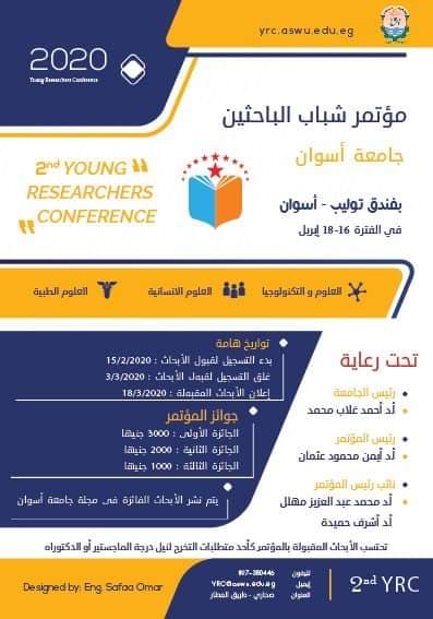 Under patronage of Prof. Ahmed Ghallab – Aswan University President and headed by Dr/Ayman Othman _Vice president for graduate studies and research and under supervision of Prof. Mohamed Abdel-Aziz Mehalel_ vice dean of Faculty of Engineering for Graduate Studies and research, in frame of encouraging scientific research and the state’s interest in educational and research institutions to achieve the desired luxury for humanity, Aswan University organized the Young Researchers Conference from 16th-18th April 2020,