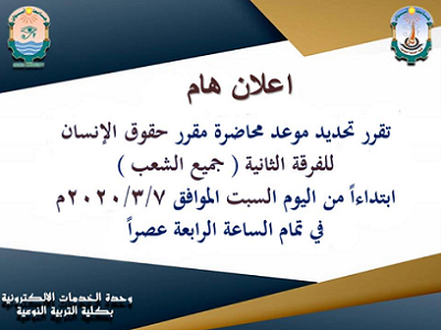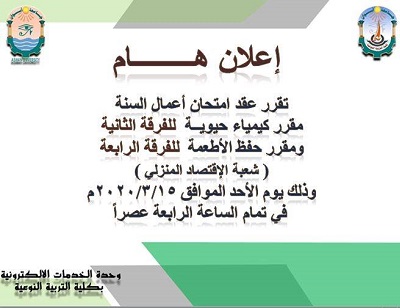 . اعلان عن عقد إمتحان أعمال السنة لمقرر كيمياء حيوية للفرقة الثانية، ومقرر حفظ الأطعمة