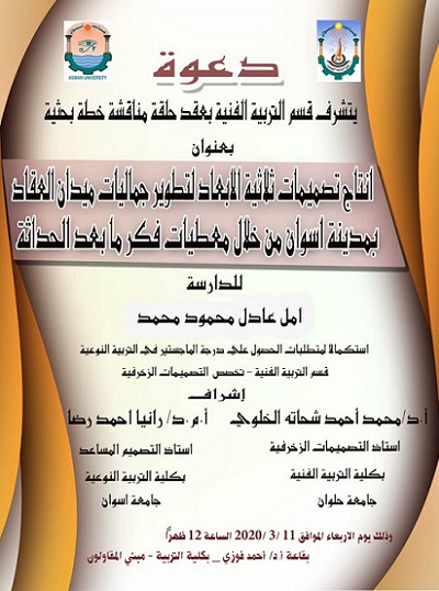 . دعوة لحضور مناقشة رسالة الماجستير المقدمة من الباحث/ اسلام محمد ابراهيم -المعيد بالكلية تخصص