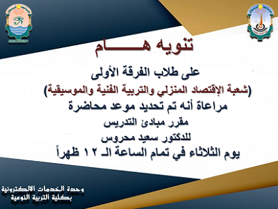 – تنويه هــــــــام لطلاب الفرقة الأولى شعبة الإقتصاد المنزلي والتربية الفنية والموسيقية