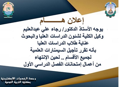 – تقرر تأجيل السيمنارات العلمية لحين الإنتهاء من امتحانات الفصل الدراسى الأول