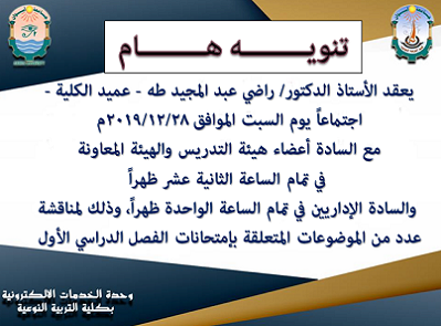 – يعقد الأستاذ الدكتور/ راضي عبد المجيد طه عميد الكلية – اجتماعاً يوم السبت الموافق