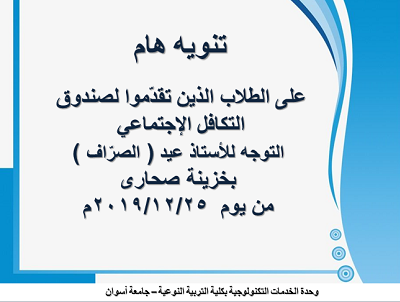على الطلاب الذين تقدّموا لصندوق التكافل الإجتماعي التوجه للأستاذ عيد ( الصرّاف ) بخزينة صحارى
