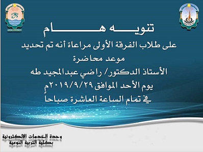 تقرر تحديد موعد محاضرة الأستاذ الدكتور/ راضي عبدالمجيد طه يوم الأحد الموافق 2019/9/29