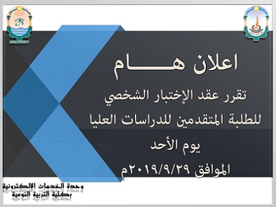 تقرر عقد الإختبار الشخصي للطلبة المتقدمين للدراسات العليا يوم الأحد الموافق 29/9/2019