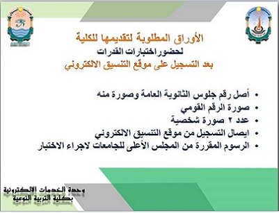 الأوراق المطلوبة لتقديمها للكلية لحضوراختبارات القدرات بعد التسجيل على موقع التنسيق الالكتروني