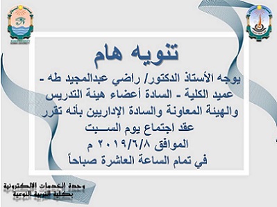 اجتماع للسادة أعضاء هيئة التدريس والهيئة المعاونة والسادة الاداريين يوم السبت الموافق 8/6/2019 في تمام