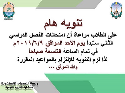 على الطلاب مراعاة أن امتحانات الفصل الدراسي الثاني ستبدأ يوم الأحد الموافق 2019/6/9 في تمام الساعة