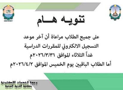 تقرر فتح باب تسجيل المقررات الكترونياً .. وطباعة استمارة التسجيل لطلاب الفرقة الثالثة .