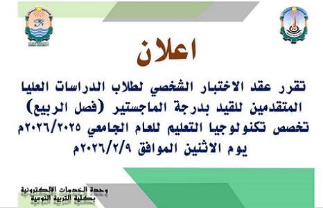 تم تحديد موعد الاختبار الشخصي لطلاب الدراسات العليا المتقدمين للقيد بدرجة الماجستير (فصل الربيع) تخصص