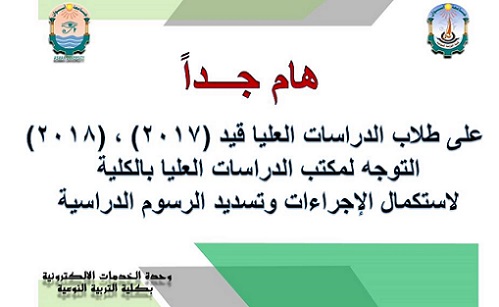 اعلان هام لطلاب الدراسات العليا قيد 2017، 2018 لإستكمال اجراءات القيد وتسديد الرسوم الدراسية.