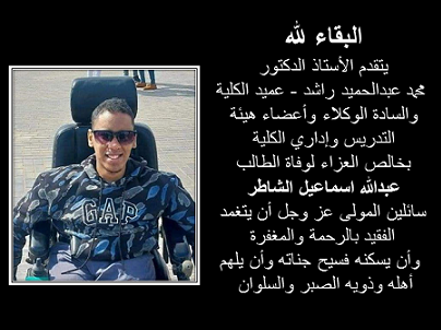 خالص العزاء لوفاة الطالب عبدالله اسماعيل الشاطر سائلين المولى عز وجل أن يتغمد الفقيد بالرحمة
