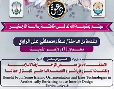 دعوة لحضور مناقشة رسالة الماجستير بقسم الاقتصاد المنزلي المقدمة من الباحثة/ صفاء مصطفى الراوي –