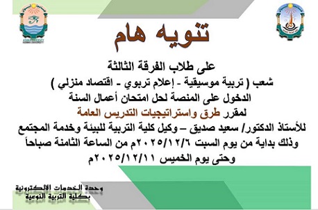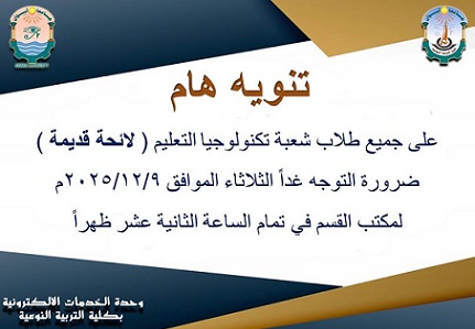 على طلاب شعبة تكنولوجيا التعليم ( لائحة قديمة ) مراعاة التوجه غداً الثلاثاء الموافق 2025/12/9