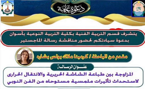 دعوة لحضور مناقشة رسالة الماجستير المقدمة من الباحثة كيرمينا ملاك – بقسم التربية الفنية يوم