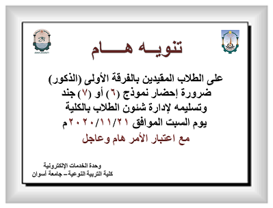 . على الطلاب المقيدين بالفرقة الأولى (الذكور) ضرورة إحضار نموذج (6) أو (7) جند وتسليمه