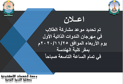 . تحديد موعد المشاركة في مهرجان الندوات الذاتية الأول يوم الأربعاء الموافق 2020/11/25 بقاعة