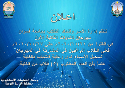 . تنظم إدارة الأسر واتحاد الطلاب بجامعة أسوان مهرجان الندوات الذاتية الأول في الفترة من