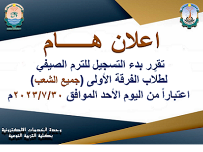 تقرِر بدء التسجيل للترم الصيفي لطلاب الفرقة الأولى (جميع الشعب) مع مراعاة أن دفع رسوم التسجيل يتم من خلال الفيزا كارت بخزينة الكلية.