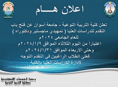 اعلان هام / اخبار / By editor / January 5, 2024 تقرر فتح باب التقدم للدراسات العليا – ماجستير – دكتوراه للعام الجامعي 2024 اعتباراً من 9/1/2024 حتى 31/1/2024