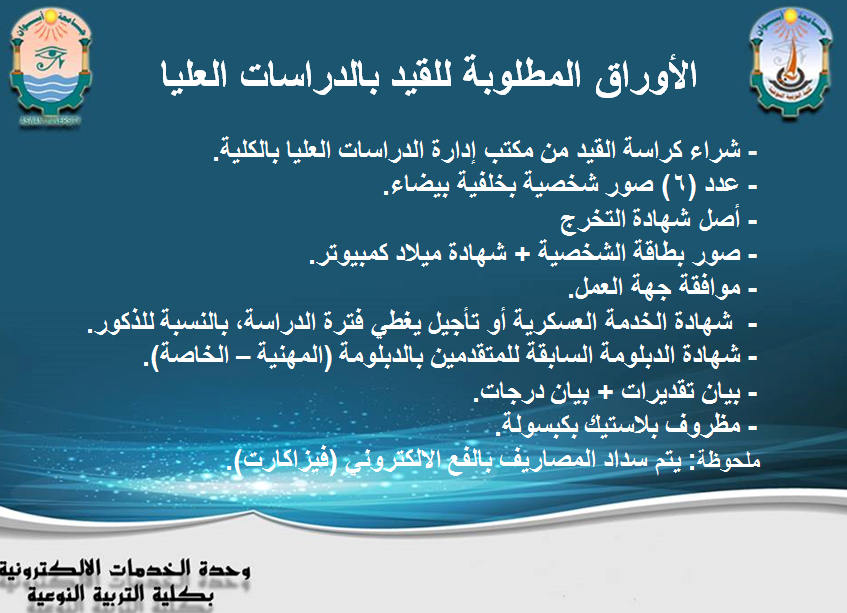 فعلى جميع الطلاب الراغبين في التسجيل الضغط على الأوراق المطلوبة للقيد والتوجه إلى إدارة الدراسات العليا بالكلية لإتمام الإجراءات.