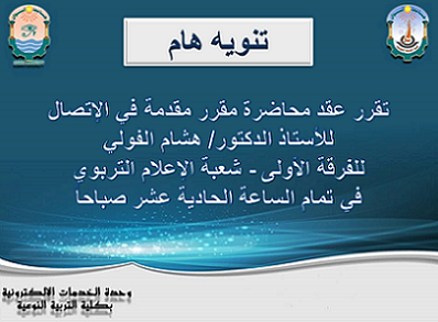 تم تحديد موعد محاضرة مقرر مقدمة في الإتصال غداً الإثنين في تمام الساعة الحادية عشر صباحاً.