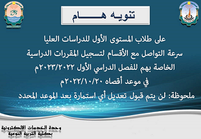 تنويه هام لطلاب الدراسات العليا – المستوى الأول حول سرعة التواصل مع الأقسام لتسجيل المقررات الدراسية الخاصة بهم .ِ