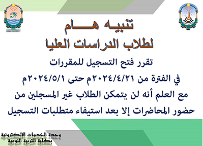 تنبيه هام لطلاب الدراسات العليا / اخبار / By editor / April 21, 2024 على طلاب الدراسات العليا مراعاة تسجيل المقررات اعتباراً من اليوم 21/4/2024 وحتى 1/5/2024