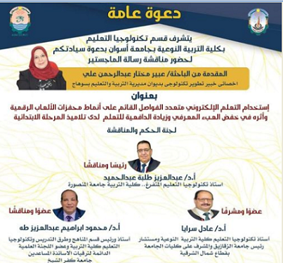 دعوة لحضور مناقشة رسالة الماجستير للباحثة/ عبير مختار عبدالرحمن – بقسم تكنولوجيا التعليم، يوم الأحد الموافق 3/3/2024 بقاعة الدكتور أحمد فوزي.