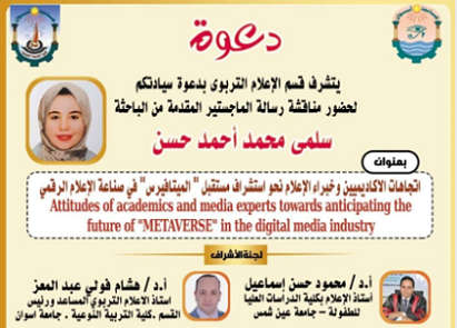 دعوة لحضور مناقشة رسالة الماجستير للباحثة/ سلمى محمد حسن – بقسم الإعلام التربوي، يوم الاثنين الموافق 4/3/2024 بقاعة الدكتور أحمد فوزي في تمام الساعة الرابعة عصرا.