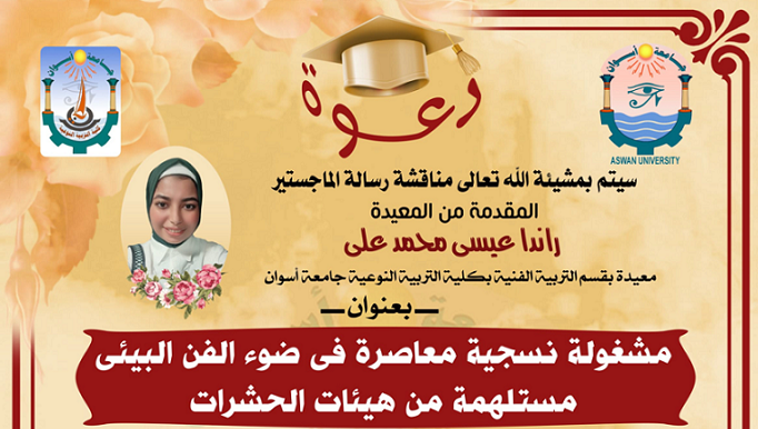 دعوة لحضور مناقشة رسالة الماجستير للباحثة/ راندا عيسى – المعيدة بقسم التربية الفنية تخصص أشغال فنية يوم الخميس الموافق 5/9/2024 بقاعة الدكتور أحمد فوزي.