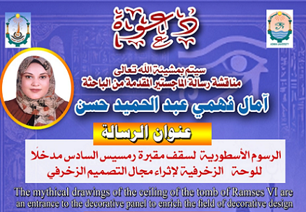 دعوة لحضور مناقشة رسالة الماجستير المقدمة من الباحثة/ امال فهمي– شعبة التربية الفنية يوم الخميس الموافق 14/11/2024 في تمام الساعة الثانية عشر ظهراً بقاعة الدكتور/ أحمد فوزي.